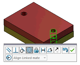 您可以對正結合以與第一個或第二個同軸心結合完全解除,並將偏移套用至未對正的同軸心結合。 或者您可以將偏移同樣套用至這兩組結合的孔。 您也可以指定允許的公差,若未對正的結合超過該公差,則會過多定義組合件並顯示錯誤。