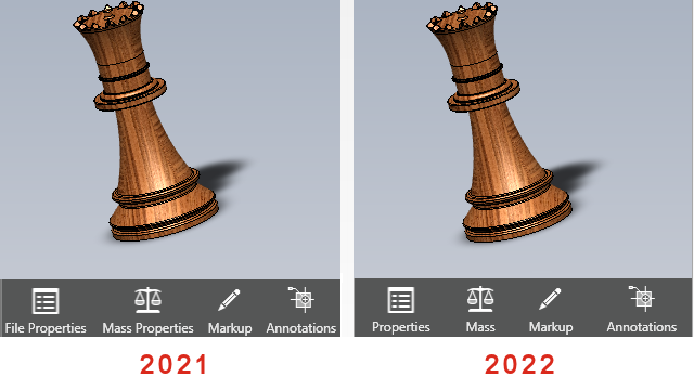 使用者介面 eDrawings 的使用者介面已經更新,以便於使用。 工具、檔案屬性與物質特性已分別變更為屬性與物質。 為了降低 eDrawings 視窗底部工具的高度,您可以移除標籤。 用滑鼠右鍵按一下工具,然後按一下顯示標示。 已選擇顯示標示 已清除顯示標示 上層主題使用 eDrawings 模型組態支援 SOLIDWORKS 中的 eDrawings 選項 檔案清單 自訂屬性選項 零組件窗格