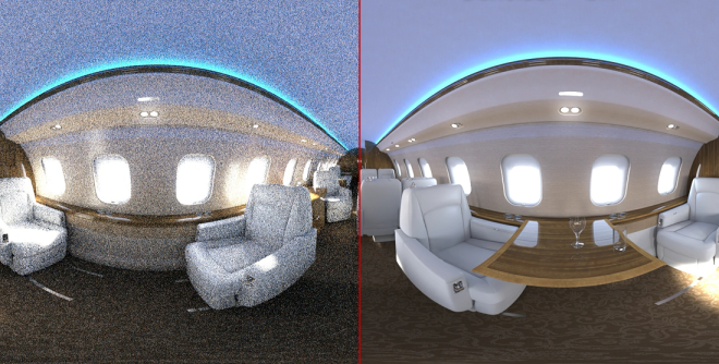 雜訊去除器使用以機器學習為基礎的後處理技術,可從使用快與準確影像計算模式產生的未加工及有雜訊的影像中篩選掉雜訊。
