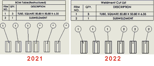 BOM 表格中的除料清單支援 零件表 (BOM) 表格中的詳細除料清單使用者介面和功能已經更新,變得更容易使用。 熔接除料清單表格更新: 表格圖示與在 FeatureManager(特徵管理員) ® 設計樹狀結構中使用的圖示相符。 在工具 > 選項 > 文件屬性 > 零件表中,選項長度變更為相同時,不考量輪廓即結合 BOM 中的除料清單項目 (舊版的運作方式) 重新命名為合併輪廓不同的相同長度除料清單項次 (pre-2019 版的運作方式)。 所有 BOM 類型都可使用詳細的除料清單。 之前,詳細的除料清單僅可用於階梯式 BOM。 您可以在零件表 PropertyManager 的詳細的除料清單區段中指定選項。 您可以自動或手動解散階梯式 BOM 中的零組件。 在零件表 PropertyManager 中,選擇解散零件層級列,以自動解散所有熔接零件層級列。 已清除詳細的除料清單,已清除解散零件層級列 已選擇詳細的除料清單,已選擇解散零件層級列 已選擇詳細的除料清單,已選擇解散零件層級列 您可以在組態屬性 PropertyManager 中,於零件表選項下,為在將零組件作為組合件時,顯示除料清單項次 (僅限含詳細除料清單的階梯式 BOM 類型) 指定選項。 此選項可顯示、隱藏或升級階梯式 BOM 的除料清單項次。 當您選擇詳細的除料清單時,升級會解散零件層級列,並顯示階梯式 BOM 中的除料清單項次。 在 FeatureManager (特徵管理員) 中,您可以在任何零組件上按一下滑鼠右鍵,然後按一下在 BOM 中還原,將零組件移回顯示除料清單。 當您為零件表中的子熔接除料清單項次使用零件號球時,零件號球屬性會對應至連結的 BOM。 在 SOLIDWORKS 2022 之前,零件號球會套用到屬於子熔接的主體,並顯示星號。 現在零件號球有對應的項次編號。 上層主題尺寸細目和工程圖 裁剪位置替換視圖 預先定義視圖 尺寸細目模式 幾何公差符號 在半徑與圓直徑間切換 工程視圖中的彎折線 零件表 對稱線性直徑尺寸