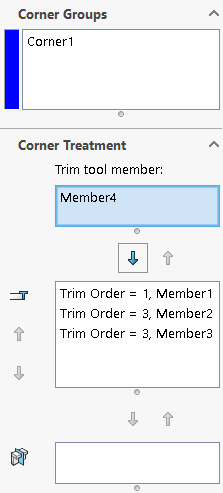 Když ve správci PropertyManager Komplexní roh přesunete člen ze skupiny Oříznutí těla do skupiny Člen ořezového nástroje, budou zbývající členy oříznuty. Oříznutí se řídí: