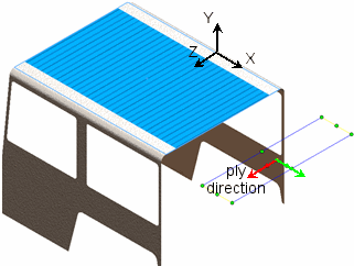 You can use one of the three orthogonal XY, YZ, or XZ planes for defining the projection direction. For example, the image shows the roof of a car frame model using the XZ plane for planar mapping. In general, the projection plane must be parallel to the shell face.