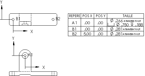 \lang\french. Les modèles standard (standard hole table--letters.sldholtbt et standard hole table--numbers.sldholtbt) créent les colonnes REPERE, POSITION X, POSITION Y et TAILLE. L'un utilise des repères alphabétiques, l'autre des repères numériques. Les tailles et les repères sont listés séparément, sans aucune combinaison.