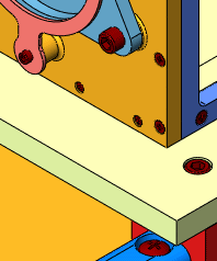 Les perçages créés à l'aide de l'Assistance pour le perçage sont équipés de la visserie correspondante. Pour les autres types de perçages, vous pouvez configurer Smart Fasteners pour ajouter tout type de boulon ou de vis par défaut. La visserie est automatiquement contrainte aux perçages par des contraintes coaxiales et coïncidentes.