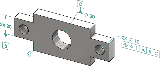 Références répétées Vous pouvez attribuer des références aux répétitions de perçage, perçages concentriques avec intervalles de séparation, répétitions de curseurs et bossages concentriques. Vous pouvez créer des références en tant que répétitions ou fonctions individuelles en utilisant les chambrages et les fraisages. Répétition de quatre perçages utilisée en tant que référence secondaire Répétition de deux perçages concentriques utilisée en tant que référence secondaire Répétition de cinq perçages radiaux utilisée en tant que référence primaire Deux fonctions de bossage utilisées pour définir la référence A Deux fonctions de largeur utilisées pour définir la référence B Deux perçages de type chambrage utilisés pour définir la référence C Deux trous fraisés utilisés pour définir la référence B Sujet parentOutils DimXpert