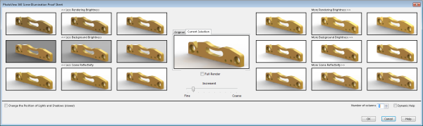La luminosité du rendu et de l'arrière-plan, ainsi que la réflectivité de la scène sont contrôlées par l'Epreuve d'illumination de scène PhotoView 360, une boîte de dialogue qui vous permet de voir rapidement un large éventail de variantes de ces paramètres.