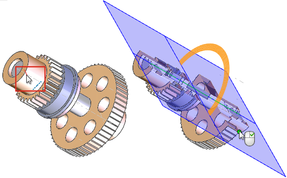 Un plan de sélection apparaît et vous permet de sélectionner des composants qui ne sont pas visibles dans le modèle ni dans la zone en coupe. Le trièdre, au centre du plan de sélection, contrôle la position et l'angle du plan de sélection.