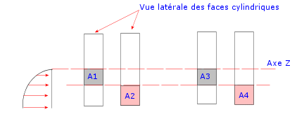 Une force de palier est appliquée aux faces cylindriques comme représenté dans la figure. Gardez à l'esprit que la force de palier est appliquée dans la direction normale à la face et que vous pouvez sélectionner des arêtes de coque circulaires. Supposons que les aires sélectionnées sont comme suit : A1=A2 et A3=A4. A2 recevra une force plus grande du fait de son emplacement d'intensité maximale dans le demi-espace. De même, A4 recevra une force plus grande que A3. Le rapport des forces reçues par les faces A1 et A3 est directement proportionnel à leur aire puisqu'elles occupent le même emplacement relatif dans le demi-espace. On peut en dire de même des faces A2 et A4.