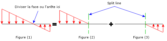 | Pour appliquer une force non uniforme dont la direction est variable [Figure(1)], il faut diviser l'entité de chargement à l'endroit où la force change de direction et appliquer la force en deux étapes [Figure (2) & Figure (3)].