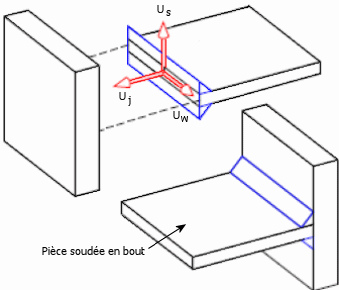 • Axe de soudure, Uw: L'axe est parallèle à la direction du cordon de soudure. Sa direction est définie par Uw = Us x Uj.