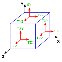 Der Spannungszustand an einem Punkt wird vollständig durch Normal- und Schubspannungskomponenten in Bezug auf ein rechtwinkliges Koordinatensystem (XYZ) definiert. Im Allgemeinen ändern sich die Werte der Spannungskomponenten, wenn das Koordinatensystem gedreht wird.