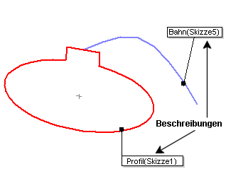 Beschreibungen sind Hilfsmittel, anhand derer Sie unterschiedliche Elemente erkennen können. Diese Beschreibungen zum Beispiel zeigen das Austragungsprofil und die Austragungsbahn. Sie können diese Beschreibungen zwar ziehen, um sie neu zu positionieren, Sie können sie aber nicht für Änderungen von Eigenschaften des zugehörigen Elements verwenden.