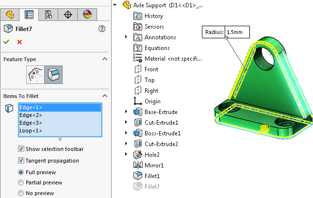Wenn ein PropertyManager aktiv ist, wird automatisch der aufschwingende FeatureManager eingeblendet. Um ihn zu erweitern, führen Sie einen der folgenden Schritte aus: