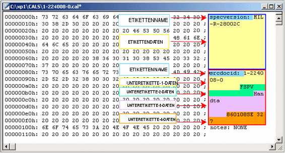 Nachstehend ist eine in einem HexEditor geöffnete CALS-Datei als Beispiel abgebildet. Sie ist farblich unterschiedlich gekennzeichnet, um die Definition der Header-Tags zu zeigen.