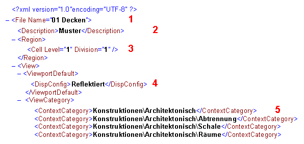 Im Beispiel: Die Attributzuordnung File/View/ViewCategory/ContextCategory gibt eine Liste mit Constructs\Architectural, Constructs\Architectural\Partitions, Constructs\Architectural\Shell usw. zurück.