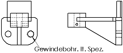 Gewindedarstellungen in Teildokumenten werden in Zeichenansichten automatisch eingefügt. Eine Gewindebeschreibung wird auch eingefügt, wenn im Zeichnungsdokument die ANSI-Norm verwendet wird. (Sie fügen Gewindebeschreibungen im PropertyManager Gewindedarstellung ein, doch diese werden nur in Zeichnungsdokumenten angezeigt.) Gewindebeschreibungen werden bei ISO, JIS und anderen Normen nicht verwendet. Sie können sie jedoch mit der Option Beschreibung einfügen im Kontextmenü einfügen (siehe nächsten Abschnitt). Um Gewindedarstellungen aus Baugruppendokumenten in Zeichnungen einzufügen, klicken Sie auf und dann auf Gewindedarstellung