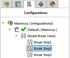 Die Bruchkantenschritte sind im Grafikbereich ausgeblendet und die Modell-Bruchkantenansicht und die Bruchkantenschritte sind im ConfigurationManager nicht mehr verfügbar.