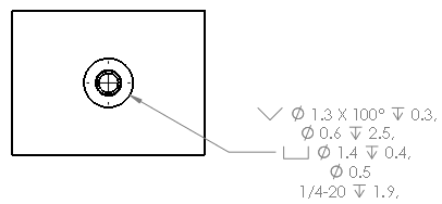 Bei einigen Bemaßungstypen wird automatisch Zusatztext eingeblendet. Die Bohrungsbeschreibung für eine Stirnsenkungsbohrung zeigt z. B. den Durchmesser und die Tiefe der Bohrung an (<MOD-DIAM><DIM><HOLE-DEPTH>xx). Bohrungsbeschreibungen für Bohrungen, die mit dem Bohrungsassistenten erstellt wurden, zeigen die Informationen vom Bohrungsassistenten an. Sie können den Text bearbeiten und Variablen aus dem Dialogfeld