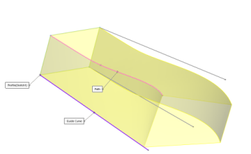 Wenn Sie Bahn und erster Leitkurve folgen auswählen, wird die Verdrehung der Zwischenprofile durch den Vektor von der Bahn zur ersten Leitkurve bestimmt. Der Winkel zwischen der horizontaler Ebene und dem Vektor bleibt in den Skizzierebenen aller Zwischenprofile konstant. Verfügbar, wenn eine oder mehrere Leitkurven ausgewählt sind.