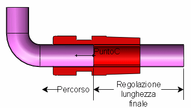 (Solo per tubature) Specifica un valore da aggiungere alla lunghezza del taglio del tubo. Si può impostare la regolazione della lunghezza finale nelle tabelle dati usando il parametro EndLengthAdjustment@CPoint<n>. Nell'esempio di seguito, un adattamento della lunghezza finale fornisce materiale extra del tubo per dare l'opportunità al fabbricatore di afferrarlo durante l'operazione di piegatura. Dopo la piegatura, il software taglia il tubo nel punto di connessione, in modo da poter aggiungere la giunzione alla fine del percorso.