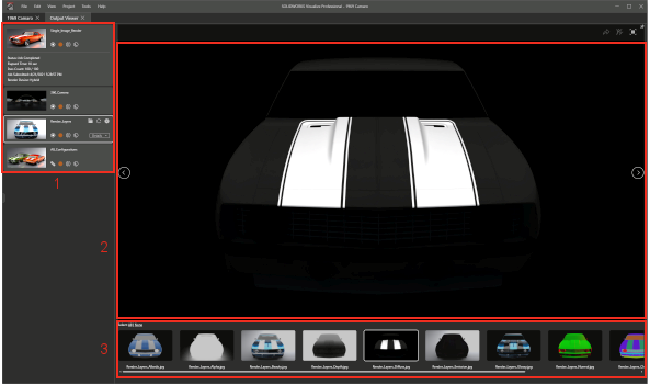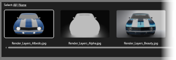 Consente di selezionare i rendering da aprire o visualizzare nella vista rendering. Quando si fa clic su una miniatura, l'immagine si apre nella vista rendering. Se si fa doppio clic su una miniatura, l'immagine si apre in un visualizzatore esterno.