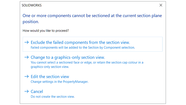 Quando SOLIDWORKS non è in grado di calcolare una vista in sezione in un assieme, è possibile escludere i componenti che causano l'errore, passare a una vista in sezione solo grafica o modificare le impostazioni nel PropertyManager.