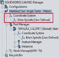 - Nella scheda Macchina della finestra di dialogo Macchina, il sistema Coordinate mandrino principale per lavorare le parti nell'assieme
