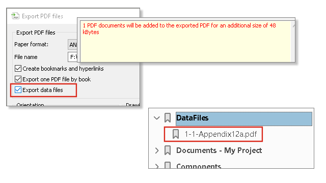 Quando si seleziona Esporta file di dati, viene visualizzato un messaggio che indica le dimensioni del file PDF. Il file PDF raccoglie tutti i file di dati in una nuova sezione.