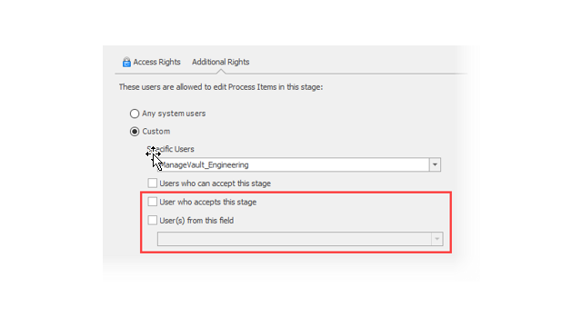 - Utenti da questo campo. Consente agli amministratori di specificare i diritti di check-out degli utenti per un campo di tipo di oggetto specificato definito per il processo.