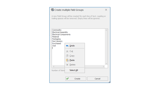 - Nella finestra di dialogo Crea più gruppi di campi, copiare e incollare i gruppi di campi da un file basato su testo.