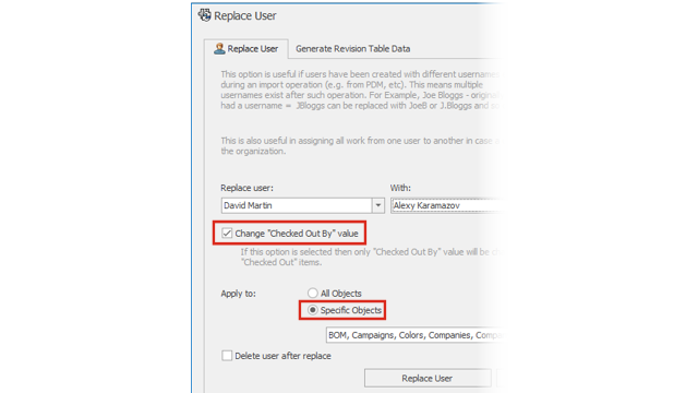 È possibile selezionare oggetti specifici per sostituire gli utenti e specificare Modifica il valore "Check-out eseguito da" per qualcuno che sostituisce l'utente selezionato.