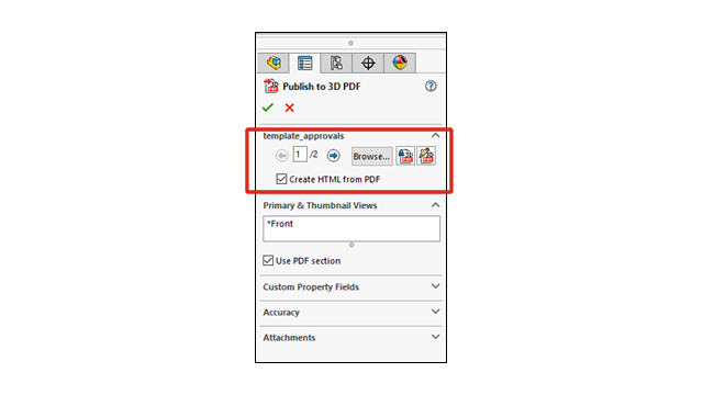 - Nel PropertyManager Pubblica su PDF 3D, sotto il nome del modello, selezionare Crea HTML da PDF e fare clic su