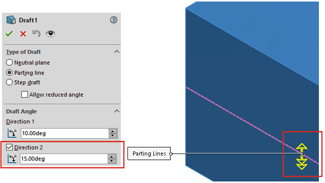 Nel PropertyManager Sformo, in Angolo di sformo, selezionare Direzione 2 e specificare gli angoli di sformo. Per usare lo stesso angolo di sformo in entrambe le direzioni, selezionare Sformo simmetrico.
