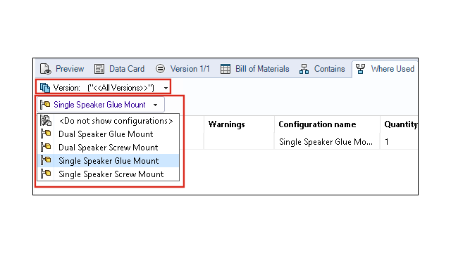 È possibile visualizzare le configurazioni dei file di parte o assieme quando si seleziona Tutte le versioni nella scheda Dove usato.