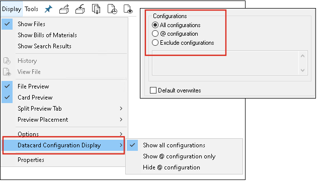 - È possibile configurare la visualizzazione delle configurazioni nelle schede dati. In SOLIDWORKS PDM File Explorer, fare clic su Visualizzazione, selezionare Visualizzazione configurazione scheda dati, quindi selezionare una delle seguenti opzioni: