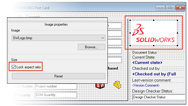 In Editor scheda, nel riquadro Proprietà immagine, selezionare Mantieni proporzioni per conservare le proporzioni dell'immagine. Fare clic su Reimposta per ripristinare la dimensione originale dell'immagine.