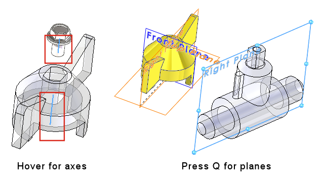 Passare con il mouse sopra gli assi provvisori delle facce e delle superfici cilindriche per visualizzare gli assi. Passare il mouse sulle facce, quindi premere Q per visualizzare i piani di riferimento. Selezionare più entità della geometria di riferimento premendo i tasti Maiusc o Ctrl. Dopo aver selezionato la geometria di riferimento, SOLIDWORKS disinserisce automaticamente tutta la geometria di riferimento non necessaria.