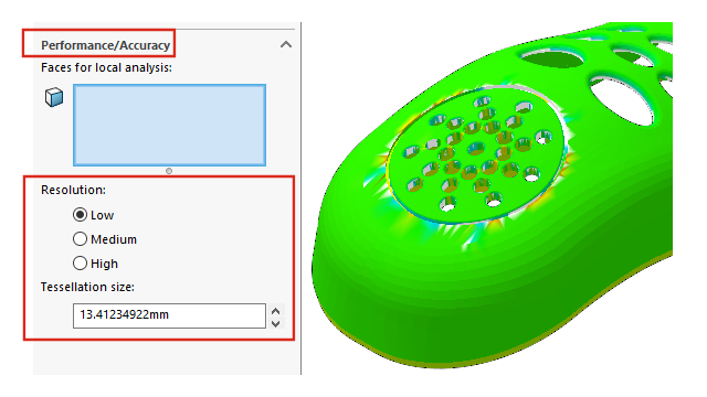 Attivare l'aggiunta SOLIDWORKS Utilities. Selezionare Strumenti > Analisi dello spessore . Nel PropertyManager, in Prestazione/Precisione, per Risoluzione selezionare Bassa, Media o Alta. In Dimensione tessellatura, il valore viene aggiornato per riflettere i valori suggeriti. Per personalizzare la risoluzione, immettere un valore personalizzato. Considerare l'utilizzo di valori personalizzati per i modelli che hanno un rettangolo di selezione grande o per definire una risoluzione specifica.