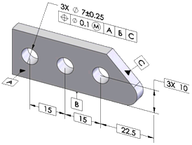 表示される寸法スキームはデータム A を第 1 データム、データム B を第 2 データム、データム C を第 3 データムとして自動寸法スキーム ツールで作成されました。 データム A と B に関連してデータム C に位置度公差が適用されたことに注意してください。