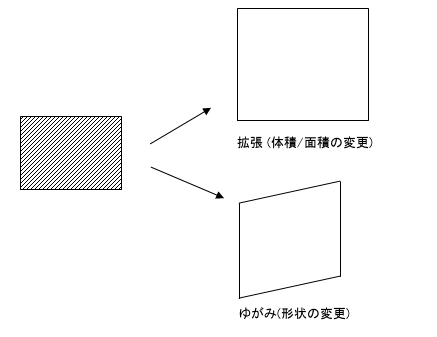 図は、2次元のモデルに荷重を与えたときの、拡張とせん断の間の相違をイラストで示しています。