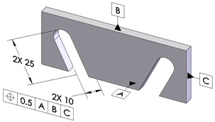 表示される寸法スキームはデータム A を第 1 データム、データム B を第 2 データム、データム C を第 3 データムとして自動寸法スキーム ツールで作成されました。 データム A と B に関連してデータム C に位置度公差が適用されたことに注意してください。