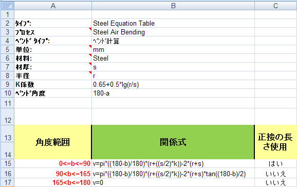 ベンド計算テーブルでは、さまざまな角度範囲を定義し、これらの範囲に対して関係式を当てはめ、部品の全体の長さを計算します。