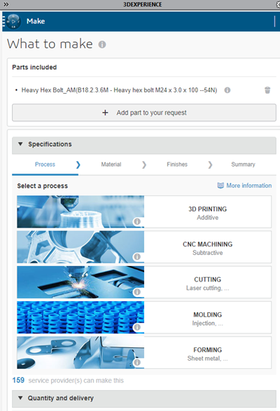 3DEXPERIENCE Marketplace | Make は、Dassault Systèmes によって運営されるオンライン オンデマンド製造プラットフォームです。 SOLIDWORKS から部品設計をアップロードし、部品を製造できるメーカーに接続することによって、設計から製造に移行できます。