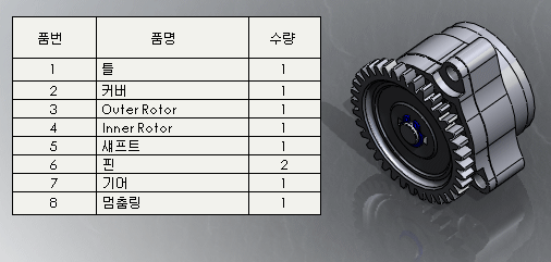 어셈블리 BOM 작성하고 저장한 후, BOM을 참조 도면에 삽입할 수 있습니다. 선택 옵션으로 어셈블리 BOM과 도면 BOM 테이블을 링크할 수 있습니다.