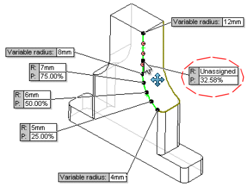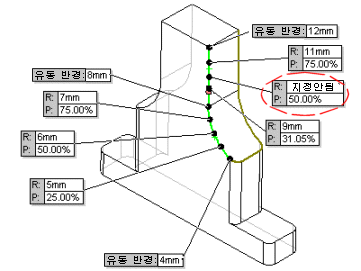대칭이나 대칭 유동 크기 필렛의 꼭지점 사이에 있는 통제점에 반지름을 지정하여 조절할 수 있습니다.