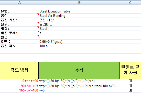 굽힘 계산 테이블에서 각도 범위를 다르게 정의할 수 있고, 그 범위에 수식을 지정하여 파트의 길이를 계산할 수 있습니다.