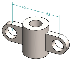 도구를 사용하여 두 개의 DimXpert 피처(곡면, 필렛, 모따기, 포켓 피처 예외) 사이에 선형 치수와 각도 치수를 부가합니다. 아래 예제에서는, 두 개의 기본형 구멍 사이에 거리 치수를 부가합니다.