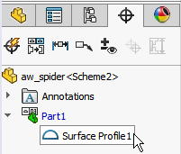 기하 프로파일 공차 편집 기하 프로파일 공차를 작성한 후에는 기하 공차 속성 대화 상자를 사용하여 수정할 수 있습니다. 기하 프로파일 공차를 편집하려면 다음을 수행합니다. DimXpertManager에서 기하 프로파일 공차 피처를 오른쪽 클릭한 후 일반 프로파일 공차 편집을 클릭합니다. 이 예에서는 곡면 프로파일 1 을 오른쪽 클릭합니다. 속성 대화 상자에서 기하 공차 옵션을 설정합니다. 확인을 클릭합니다.