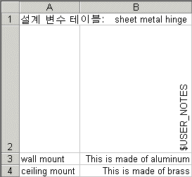 설계 변수 테이블의 사용자 노트 설계 변수 테이블에는 정보 전용(노트, 계산용 등)으로 추가의 열 또는 행을 포함할 수 있습니다. 테이블 처리에 포함하지 않을 열이나 머리글에 키워드 $USER_NOTES를 사용합니다. 이 용도로 필요에 따라 원하는 만큼 행과 열을 사용할 수 있습니다. 단테이블중간에머리글이없는행또는열을포함할수는없습니다 열 머리글은 이제 대/소문자를 구분하지 않습니다. 노트를 사용하는 설계 변수 테이블의 예: 상위 주제설정 가능한 변수