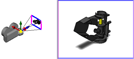 카메라 추가 DisplayManager의 화면, 조명, 카메라 아래에서 카메라 를 오른쪽 클릭하고 카메라 추가 를 클릭합니다. 왼쪽 뷰포트에 카메라가 있는 두 개의 뷰 - 수직 뷰포트가 열립니다. 오른쪽 뷰포트에는 카메라 보기가 활성 뷰 방향으로 표시됩니다. PropertyManager에서 카메라 유형, 위치 및 회전 옵션을 지정합니다. 그래픽 영역에서 카메라, 타겟, 뷰 필드를 끌어 이동할 수 있습니다. PropertyManager에서 를 클릭합니다. 뷰포트가 닫히고 모델 뷰가 원래 방향으로 돌아갑니다. 상위 주제카메라 카메라에서 모델 보기 카메라 속성 편집하기 필드 심도 카메라 표시 개체에 붙여진 카메라 예제 카메라 PropertyManager